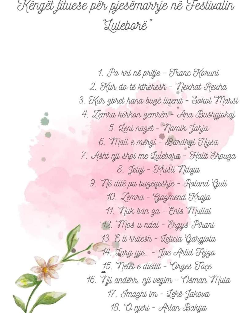 Një nga ngjarjet më të rëndësishme muzikore për qytetin e Shkodrës por edhe më gjerë mbetet padyshim festivali “Luleborë”, i cili këtë vit do të zhvillojë edicionin e tij të shtatë ndërsa thirrjes së hapur për konkurimin publik të dorëzimit të këngëve të reja, të shpallur që në muajin maj për të gjithë ata autorë këngësh, kantautorë apo poetë të cilët do të dorëzonin materialet e tyre muzikore, së fundmi është bërë me dije edhe lista me 18 këngët e vlerësua nga komisioni i drejtuar nga dyshja e njohur që edhe për këtë vit do të vazhdojë të mbajë stafetën e drejtimit të festivalit Markelian Kapidani dhe Shpëtim Saraçi