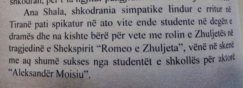 Shkrimtari i njohur kryeqytetas Bedri Alimehmeti, në librin e tij “Broduej i Tiranës”, të botuar në vitin 2019 do të shkruante për aktoren simpatike Ana Gjini (Shala).