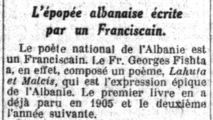 “Poeti kombëtar i Shqipërisë është një françeskan. At. Gjergj Fishta, ka shkruar, në fakt, një poemë, “Lahuta e Malcis”, e cila rrëfen epopenë e Shqipërisë. Libri i parë u botua në vitin 1905 dhe i dyti në vitin pasues.