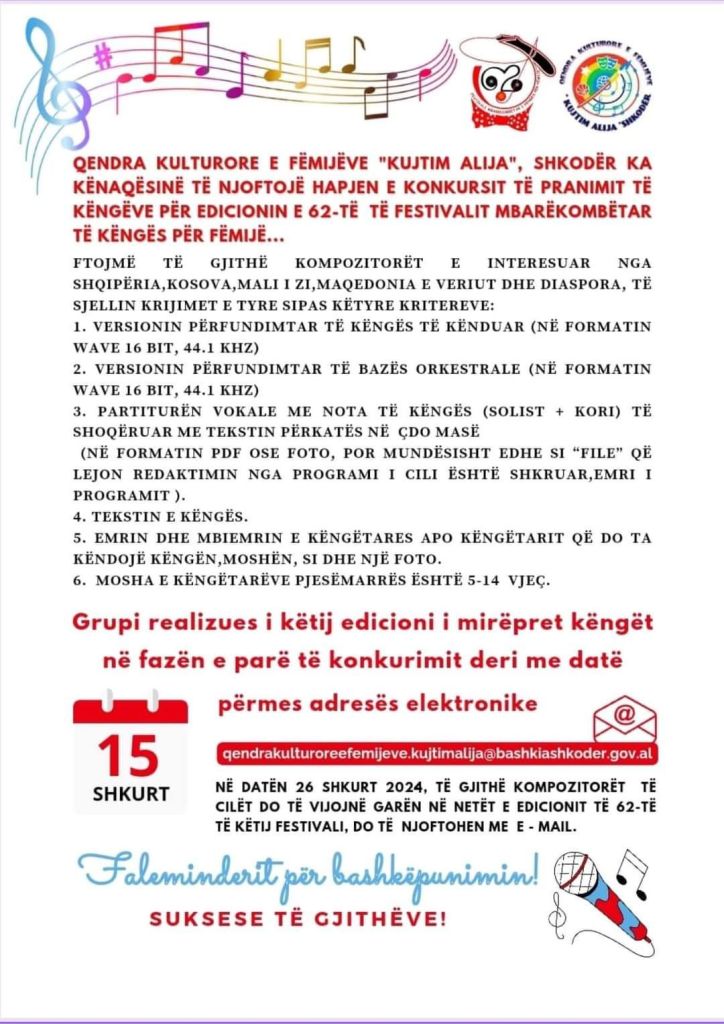 Në kuadër të edicionit të ri të festivalit për fëmijë, atij të 62-të, QKF “Kujtim Alija” vazhdon të mbajë të hapur thirrjen për të gjithë kompozitorët e interesuar nga Shqipëria, Kosova, Mali i Zi, Maqedonia e Veriut dhe diaspora për sjelljen e materialeve duke respektuar kriteret përkatëse të pranimit në festival. Sa i përket moshës së këngëtarëve pjesëmarrës ajo mbetet 5 – 14 vjeç. Kjo është faza e parë e konkurimit dhe ajo do të zgjasë deri më 15 shkurt. 11 ditë më vonë, më 26 shkurt do të shpallen edhe emrat e kompozitorëve fitues nga komisioni i vlerësimit të tyre.