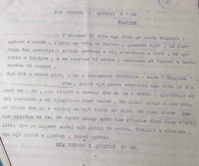 Fragmenti është shkëputur nga dorëshkrimet me titull: “Një refren i qytetit tim, kujtime me Migjenin”, trashëgimni e familjes Gjyli, dhe që po e ndajmë me ju;
