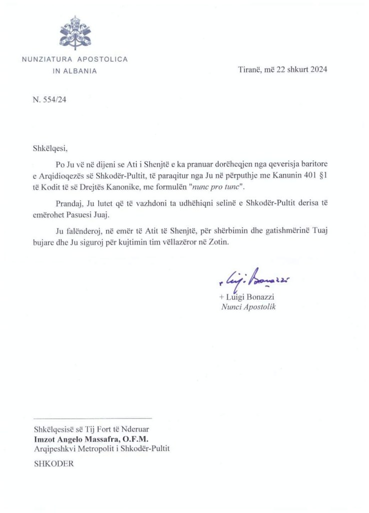 Kancelari i Ardioqezës Shkodër – Pult, Atë Artan Seli lexoi Dekretin e Selisë së Shenjtë që pranon dorëheqjen e Imzot Angelo Massafrës nga detyra e tij. Imzot Massafra falenderoi çdonjërin për besimin e dhënë në detyrën si ipeshkv.