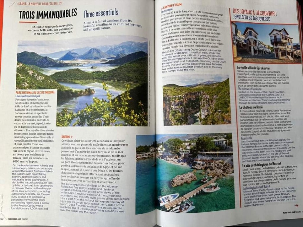 Kështu shkruhet në revistën PARIS VOUS AIME, që shpërndahet për turistët e huaj në dy aeroportet franceze, Paris-Charles de Gaulle and Paris-Orly, ku promovohet edhe vendi ynë.