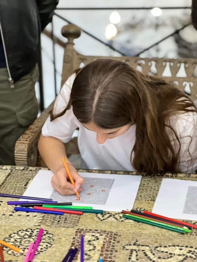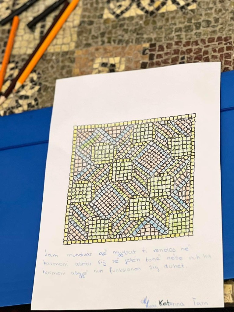 Pas njohjes me historinë e zbulimit të Mozaikut të Antikitetit, punëtoria nxiti të rinjtë të kuriozoheshin për periudhën e antikitetit duke identifikuar simbolet që shfaqen në mozaik, si ato reflektojnë kulturën dhe vlerat e kohës në kontekstin e trashëgimisë dhe si duhen dokumentuar si gjetje arkeologjike.