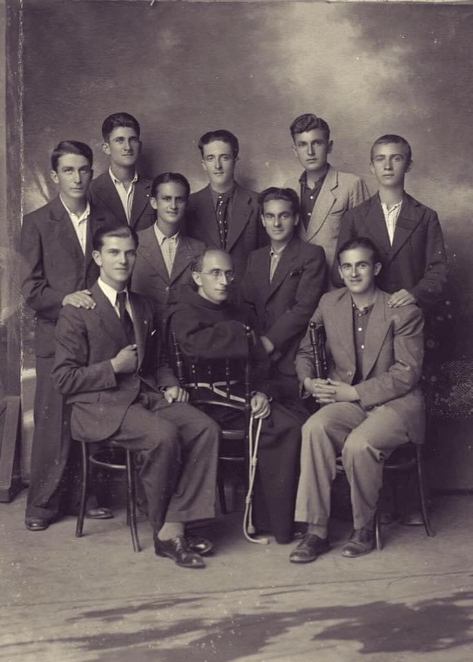 I rrethuar nga nxenësit etur për dijet e sapo aguara të mesuesit, shfaqen madheshtorë në këtë foto të Marubit, i lumi Atë Gjon me nxenësit e kolegjit.