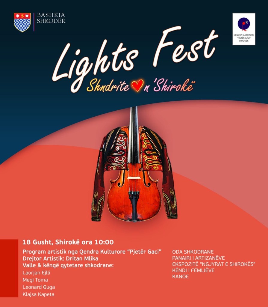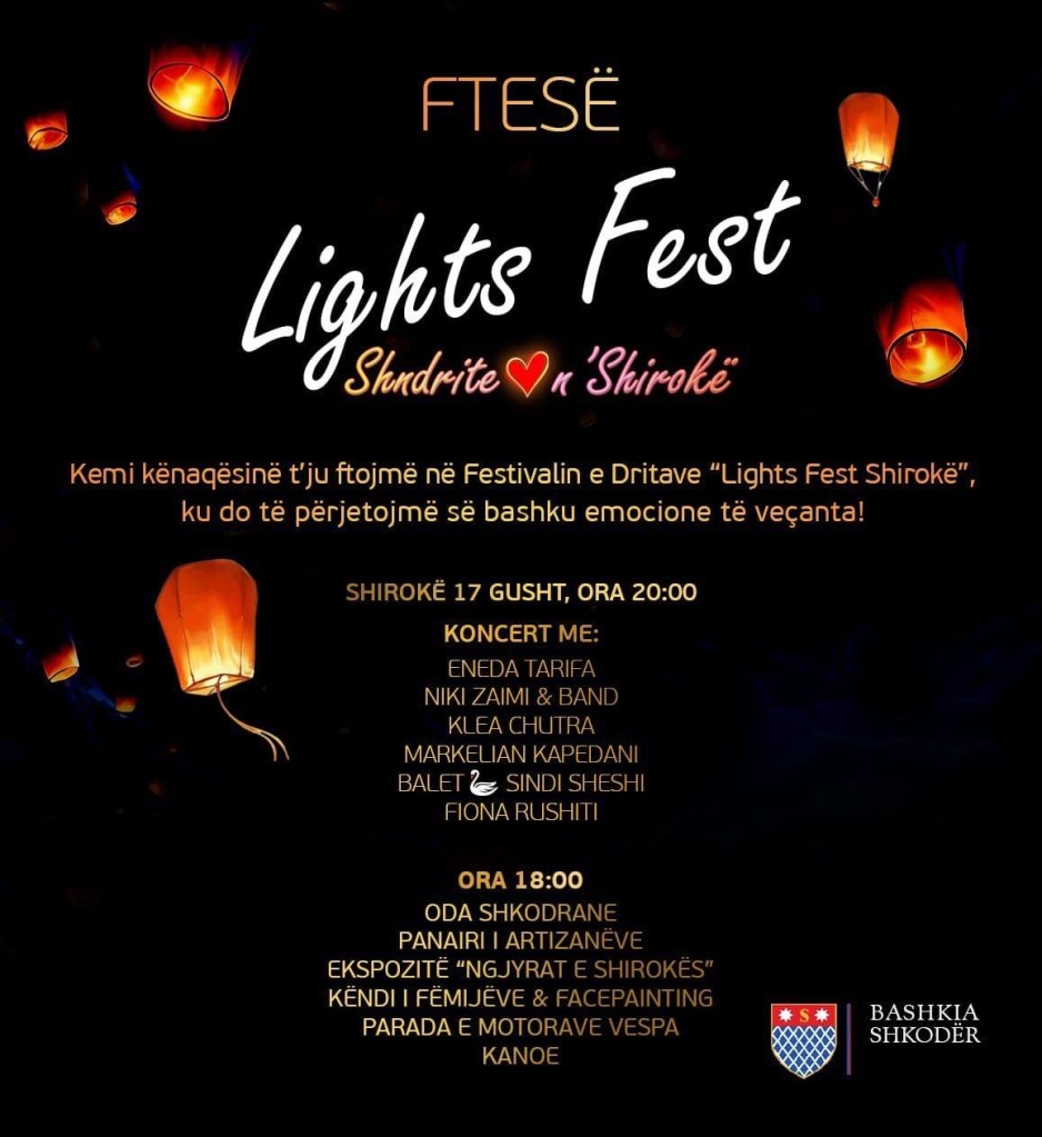 Sheshi në Shirokë do të konceptohet si një akuarium 3D, në të cilën do të pozicionohet skena. Aktiviteti do të zhvillohet në dy fasha orari: ato sportive dhe ujore paradite ndërsa aktivitetet artistike nga ora 18:00 e deri në orët e vona të mbrëmjes. Në Festivalin e Dritave do të synohet të krijohet tradita e “feneri i qiellit” mbi liqenin e Shkodrës.