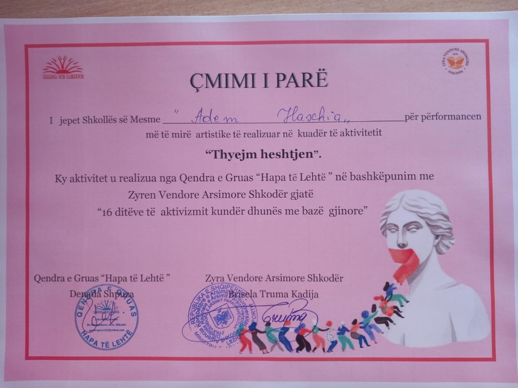 Në konkursin “Thyejmë heshtjen”, zhvilluar me datën 16 dhjetor 2024, nga ora 10.30 deri në orën 13.00, pranë ambjenteve të Shkollës së Muzikës “Prenkë Jakova”, në kuadër të 16 ditëve të aktivizimit kundër dhunës me bazë gjinore, nxitur nga ZVAP Shkodër në bashkëpunim me Qendrën e Gruas “Hapat e Lehtë”, me synim dhënien e mesazheve nga nxënësit në lidhje me rëndësinë e parandalimit të dhunës në familje dhe atë ndaj gruas, si dhe të pasojave që ajo lë te viktimat, mes 14 shkollave të mesme të kësaj Zyre Vendore, shkolla “Adem Haxhija” në Postribë mori pjesë me performancën “Mrekullisht e krijuar”.