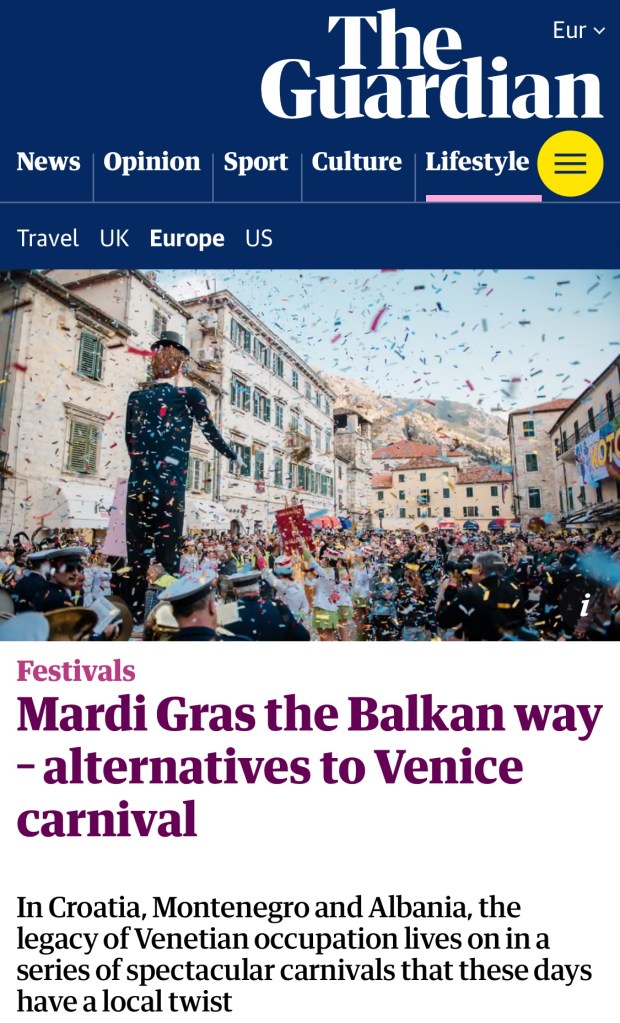 Në Kroaci, në Malin e Zi dhe në Shqipëri, trashëgimia e pushtimit venecian jeton në një seri karnavalesh spektakolare, që këto ditë kanë një aromë lokale, shkruan Camilla Bell-Davies për “The Guardian”. Udhërrëfyesja ime, Jovana Markic ngre një gotë verë nga një tavolinë rruge në qytetin e vjetër të Kotorrit dhe ngre një dolli: “Abrum!”