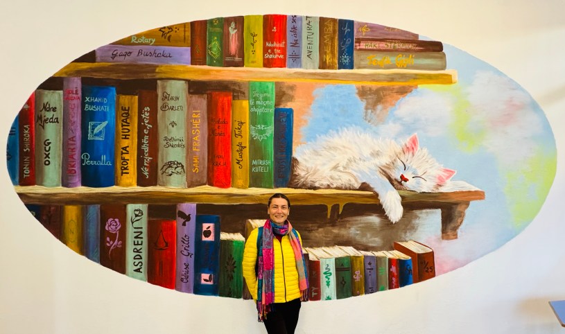 Në një nga sallat e Bibliotekës “Marin Barleti” në Shkodër, një vepër artistike tërheq menjëherë vëmendjen. Ngjyrat e ndezura, librat e autorëve shqiptarë dhe një mace e bardhë në gjumë, janë elementët që e bëjnë këtë mural të veçantë.