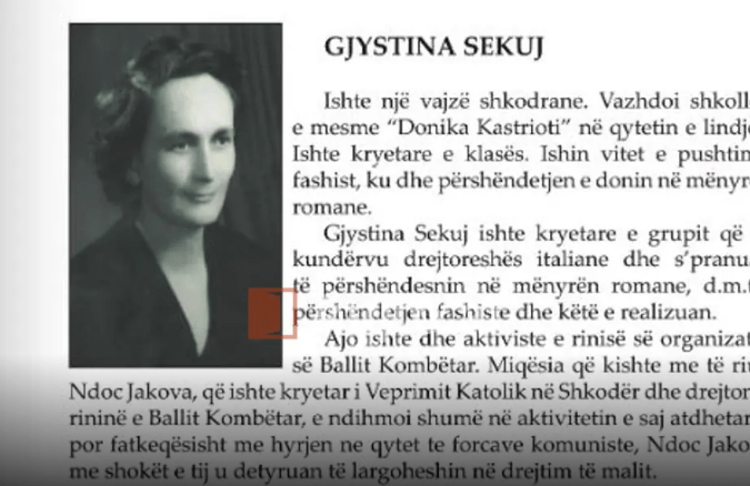 Gjystina Sekuj ishte një vajzë shkodrane e cila studoi në shkollën e mesme “Donika Kastrioti” në qytetin e lindjes. Ishte kryetare e klasës. Ishin vitet e pushtimit fashist, ku dhe përshëndetjen e donin në mënyrë romane. Ajo ishte kryetare e grupit që iu kundërvu drejtoreshës italiane dhe s’pranuan të përshëndesnin në mënyrë romane, d.m.th. përshëndetjen fashiste dhe këtë e realizuan.