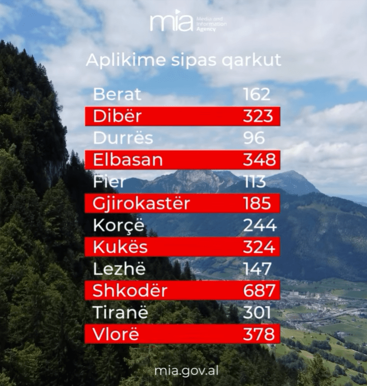 Sipas të dhënave të Agjencisë për Median dhe Informacionin (MIA), deri tani janë regjistruar 3308 aplikime në rang kombëtar. Në krye të listës qëndron Qarku i Shkodrës me 687 aplikime, ndjekur nga Vlora me 378 dhe Elbasani me 348.