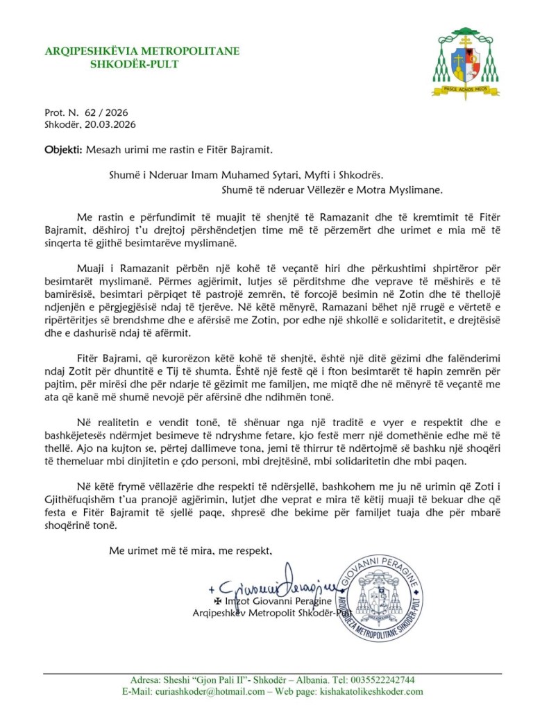 Në të njëjtën frymë, Arqipeshkëvia Metropolitane Shkodër-Pult përcolli një mesazh urimi për komunitetin mysliman përmes një letre zyrtare.