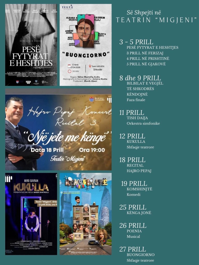Teatri “Migjeni” ka publikuar kalendarin artistik të prillit, me një program të larmishëm aktivitetesh që përfshin shfaqje teatrore, komedi, musical, recital dhe koncert simfonik. Në axhendën e këtij muaji bien në sy produksionet “Pesë fytyrat e heshtjes”, “Kukulla”, “Komshinjtë”, “Poenia”, si edhe finalja e “Bilbilat e vegjël të Shkodrës këndojnë”.